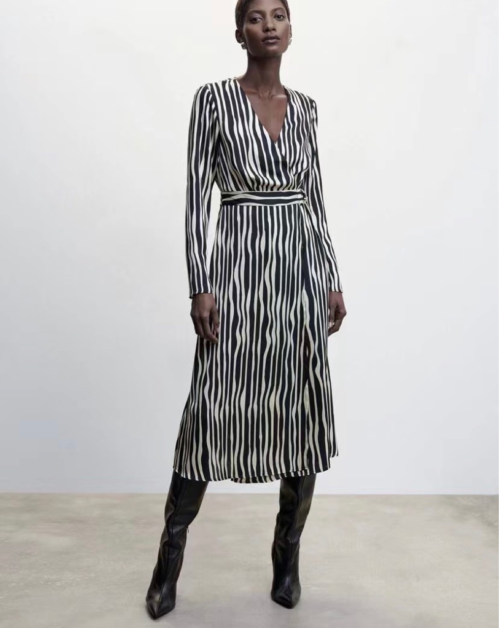 M MNG Za Temperament Commute Fusta asimetrică cu mânecă lungă Salopetă cu talie mijlocie Rochie neagră cu dungi de gamă înaltă imprimată